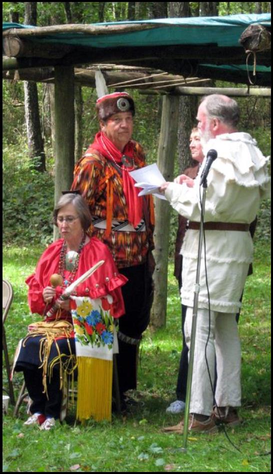 Greentown Preservation Association President William E. Jones welcomes Michael and Ella Pace of the Delaware Tribe of Bartlesville, Okla., to the Greentown Gathering |