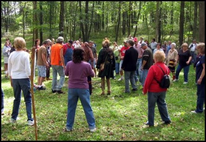 Greentown visitors join with living history participants in a social dance circle in a natural amphitheater on the site, |