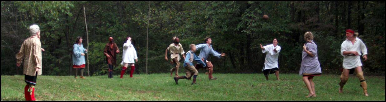 An oval leather ball filled with pine needles was made by Greentown’s living history interpretation director Doc Shaffer. Two poles were set up on either side of the playing field, about 150 feet long.
